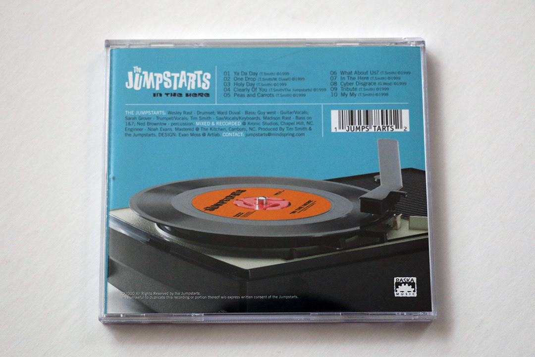 CD Packaging for the North Carolina ska band, The Jumpstarts. The idea was to have the CD look like a 45 record. The CD packaging itself looks like a vintage record player. The top of the case was left clear with a record player arm so when it was closed it looked like the record was being played.